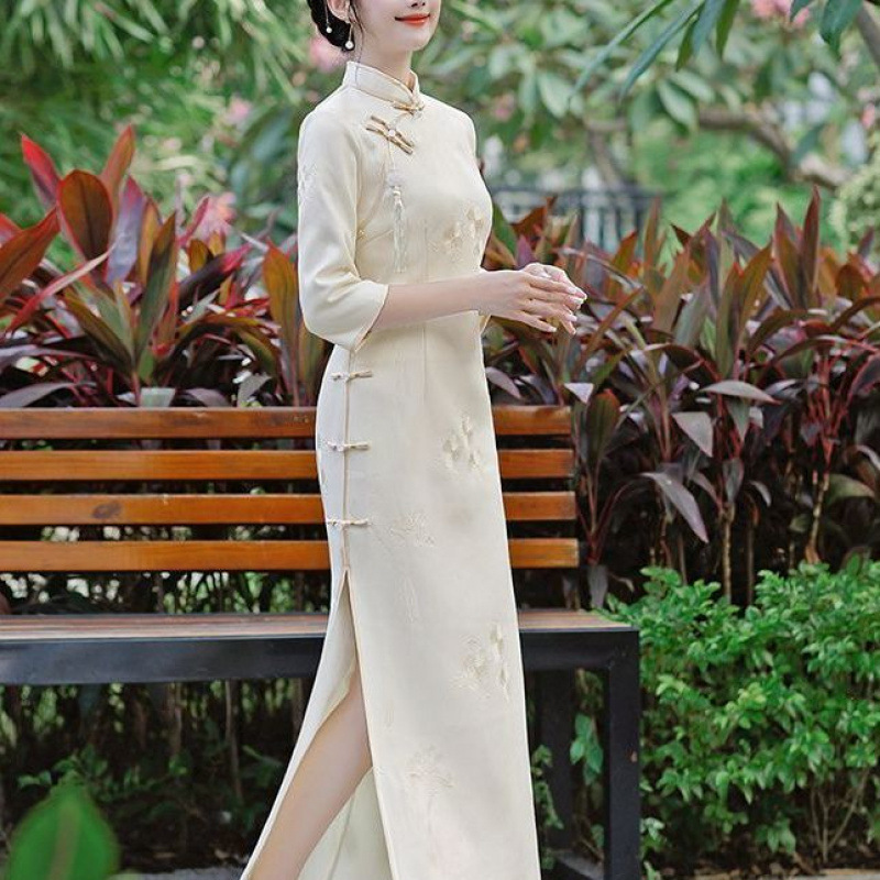 Gaun Cheongsam Modifikasi Gaya Tiongkok Baru Gaun Membentuk Pinggang Mewah Ringan Elegan Wanita Muda Gaya Senior Rok Panjang
