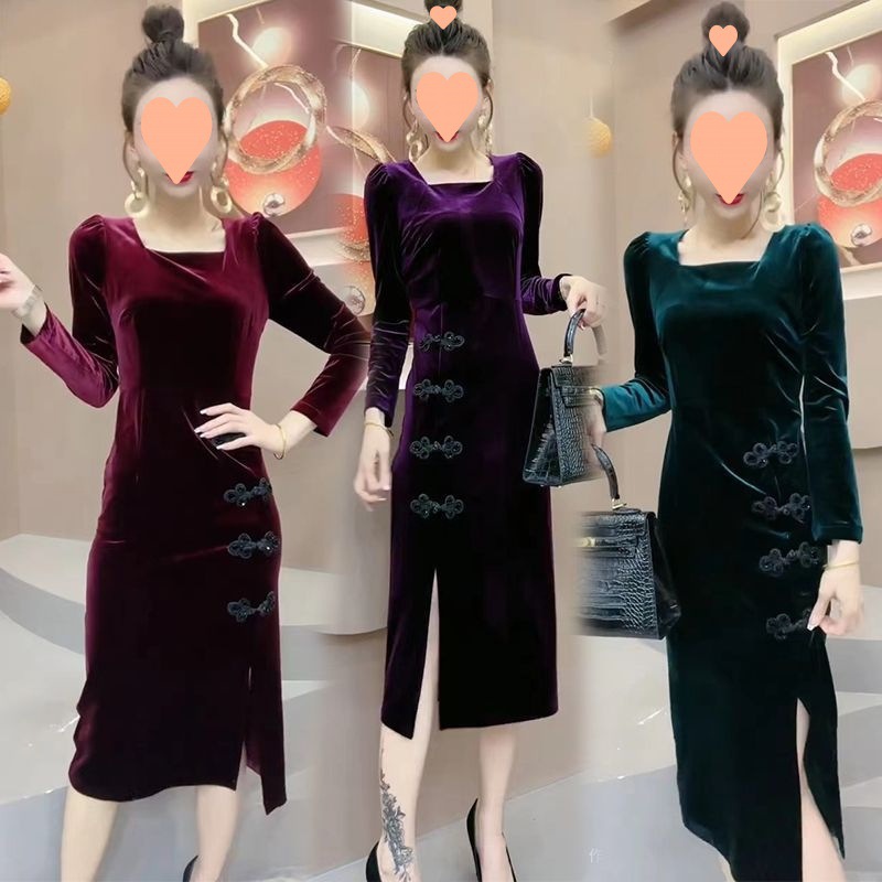 Gaun kancing gaya Cina tahun 2025, gaun beludru multi-warna, gaun cheongsam, modis dan bergaya.