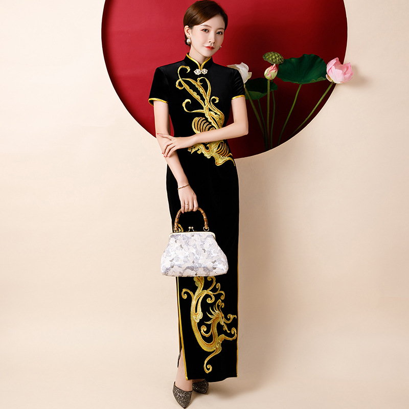 Catwalk Cheongsam Beludru Emas Gaya Baru Elegan Gaya Cina Gaun Pertunjukan yang Ditingkatkan Kostum Cheongsam untuk Musim Panas.
