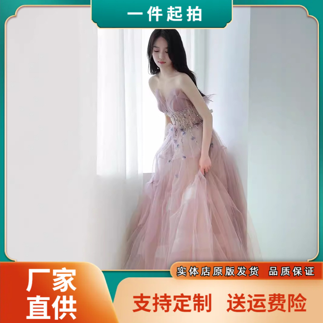 2025新款黄色晚礼服裙抹胸轻奢仙气质彩纱法式婚纱裙外贸晚礼服