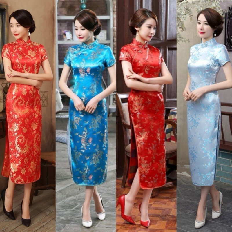 Gaun Berat/Sutra Rok Cheongsam Modifikasi Wanita Lebar Ukuran Besar/Sutra Rok Panjang Sedang Warna Bunga