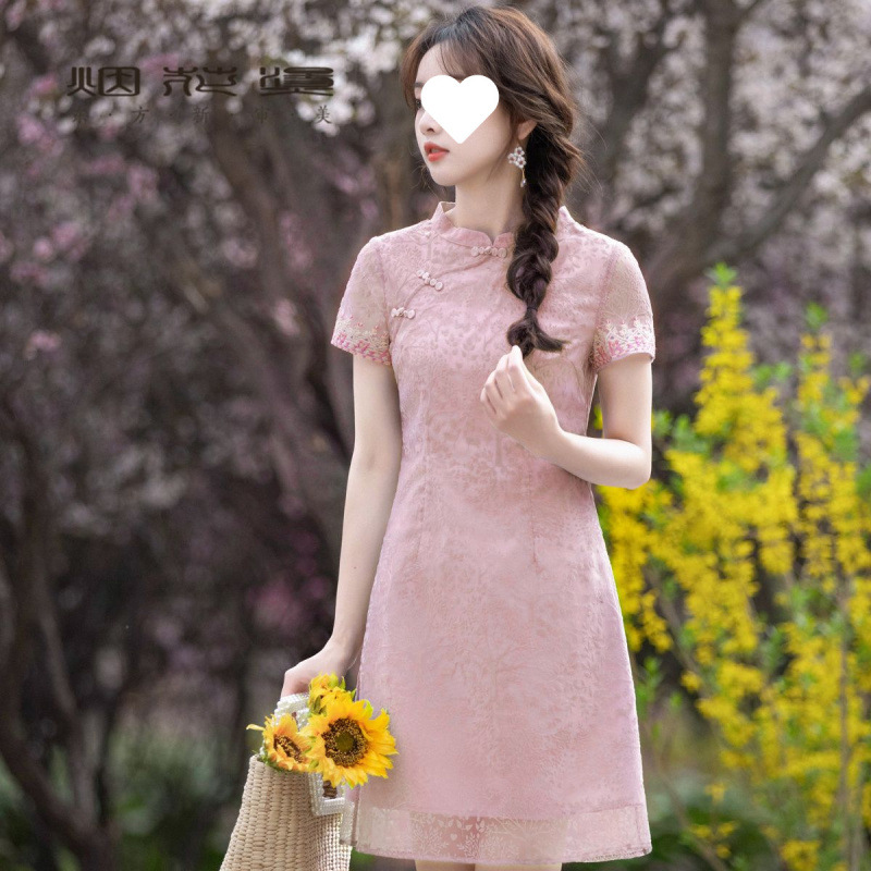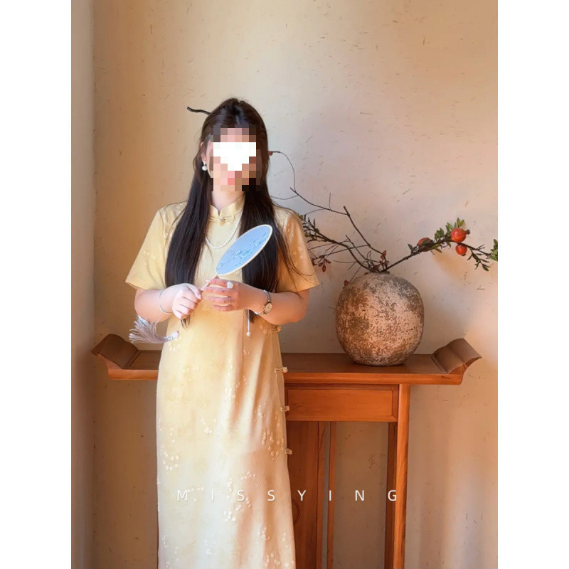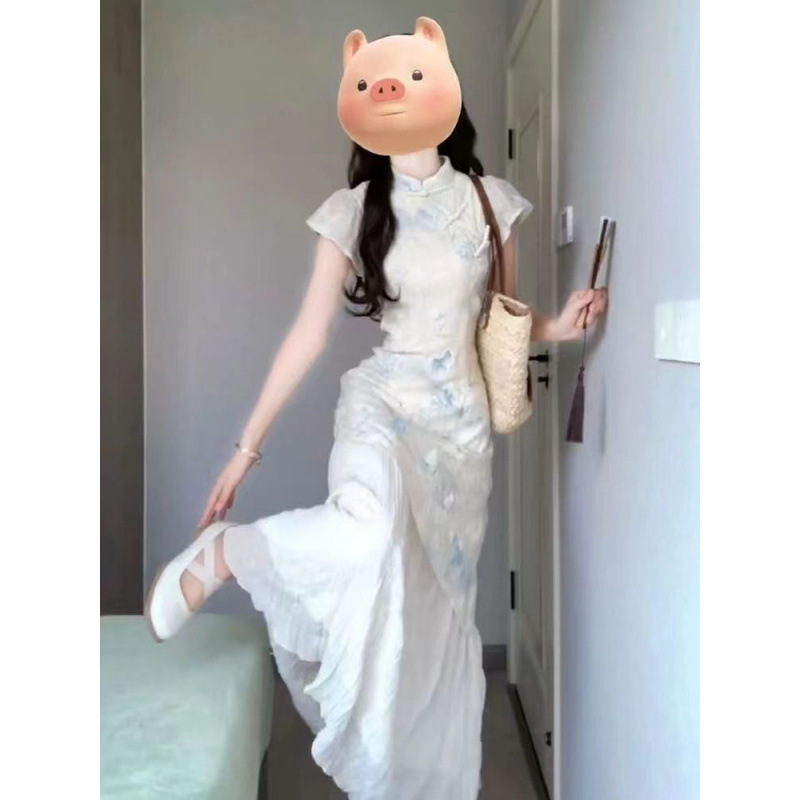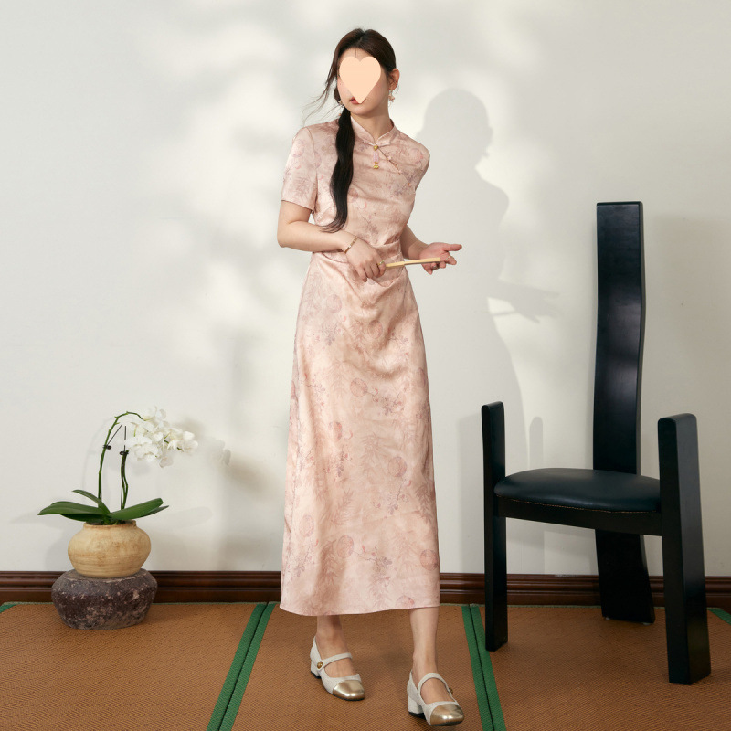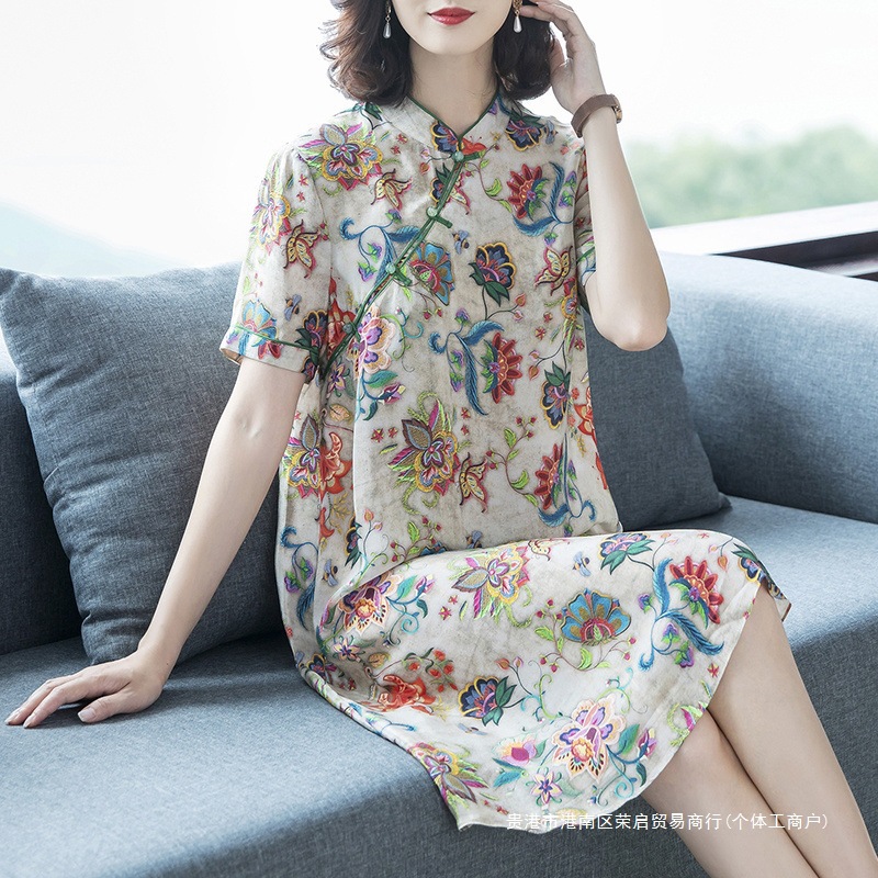 Gaun Dingin Kancing Kancing Gaya Tiongkok Baru Rok Cheongsam Modifikasi Cetak Terlihat Langsing Membentuk Pinggang Membentuk Pinggang Gaya Lembut Model Baru Musim Panas