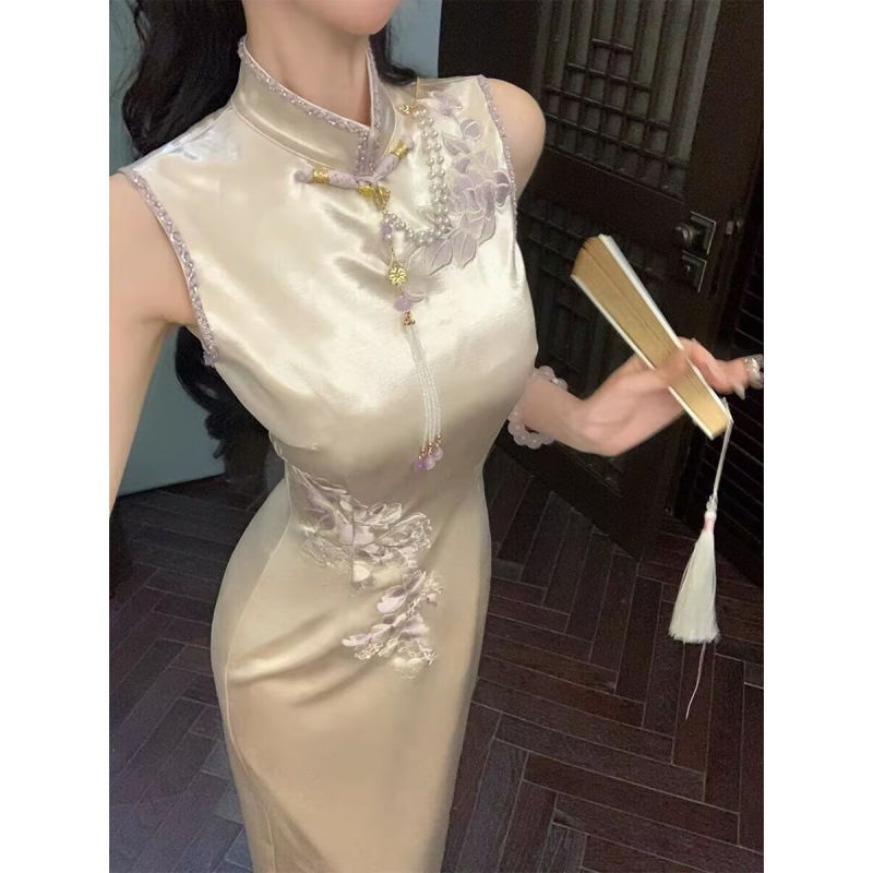 Cheongsam Modifikasi Gaya Tiongkok Baru Gaun Manik-manik Berkualitas Tinggi Bordir Pekerja Berat Sehari-hari Muda Gaun Elegan Desain