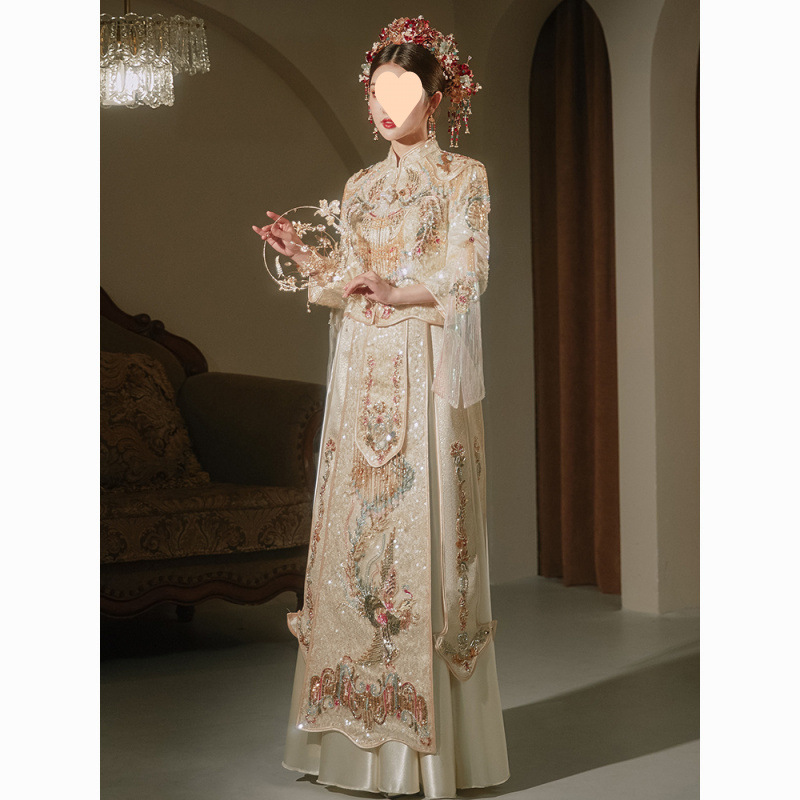 Pakaian Pertunjukan Warna Emas Model Baru 2025 Gaun Pengantin Gaya Tiongkok Senior Gaun Pengantin Wanita Pakaian Bersulang