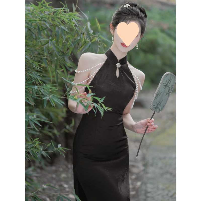 Gaun Malam Cheongsam Modifikasi Gaya Tiongkok Baru Seksi Gaun Gantung Leher Ramping Sosialita Elegan Suster Musim Panas Wanita