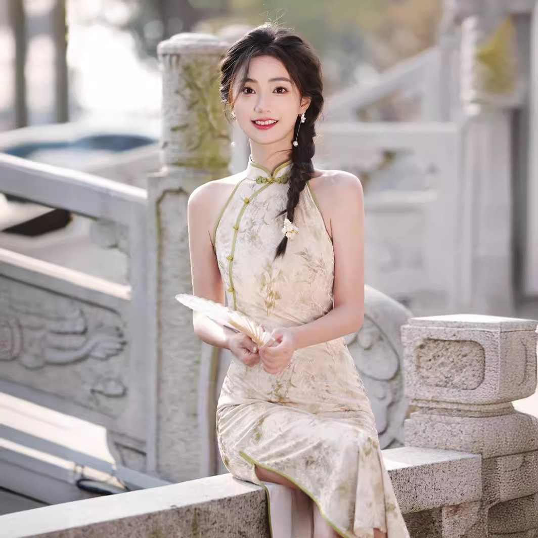 Gaun Cheongsam untuk Lapangan Malam Malam Ketat Pinggang Kancing Ketat Pinggang Gesper Gesper Punggung Terbuka Desain Gantung Leher Tanpa Lengan Retro Gaya Tiongkok Baru