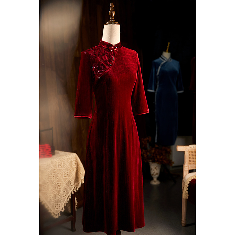 Gaun pengantin cheongsam beludru, gaun pengantin retro untuk ibu dan bibi ukuran besar