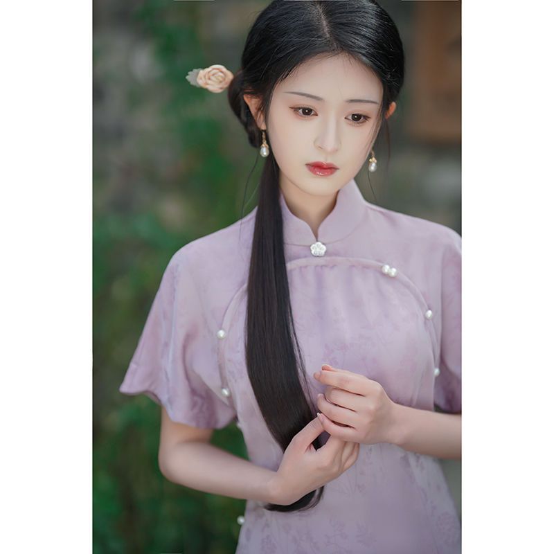 Gaun cheongsam Lengan besar terbalik ungu panjang untuk anak perempuan musim panas baru 2023 peningkatan kelas atas retro gaya muda elegan