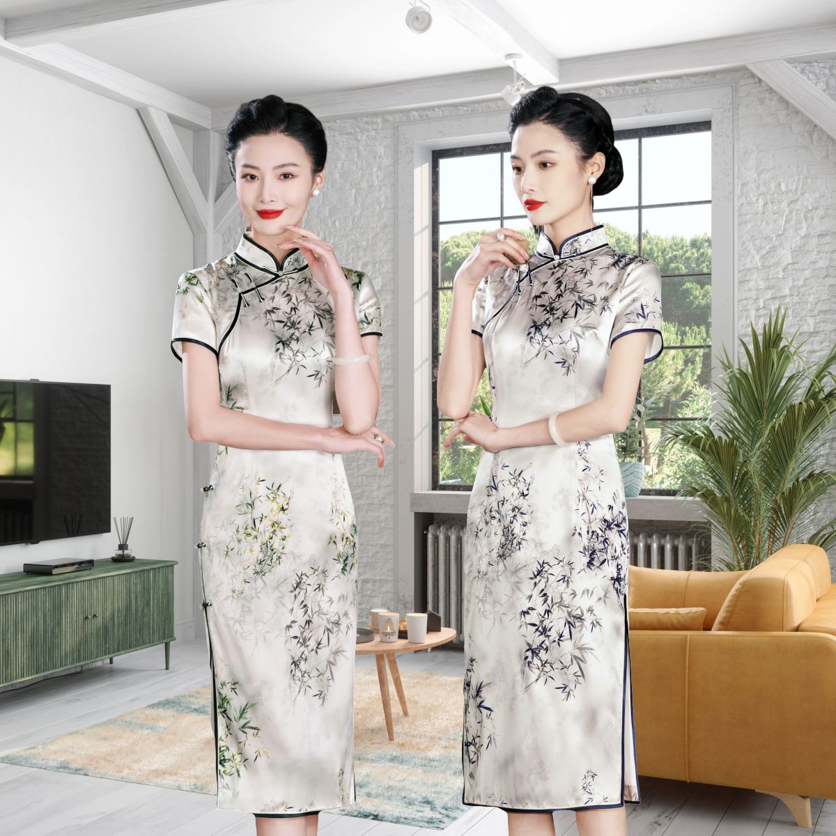 Gaun pengantin qipao panjang sedang untuk ibu, gaun pesta satin asetat untuk ibu mertua, gaun pesta 6872, gaya retro artistik.