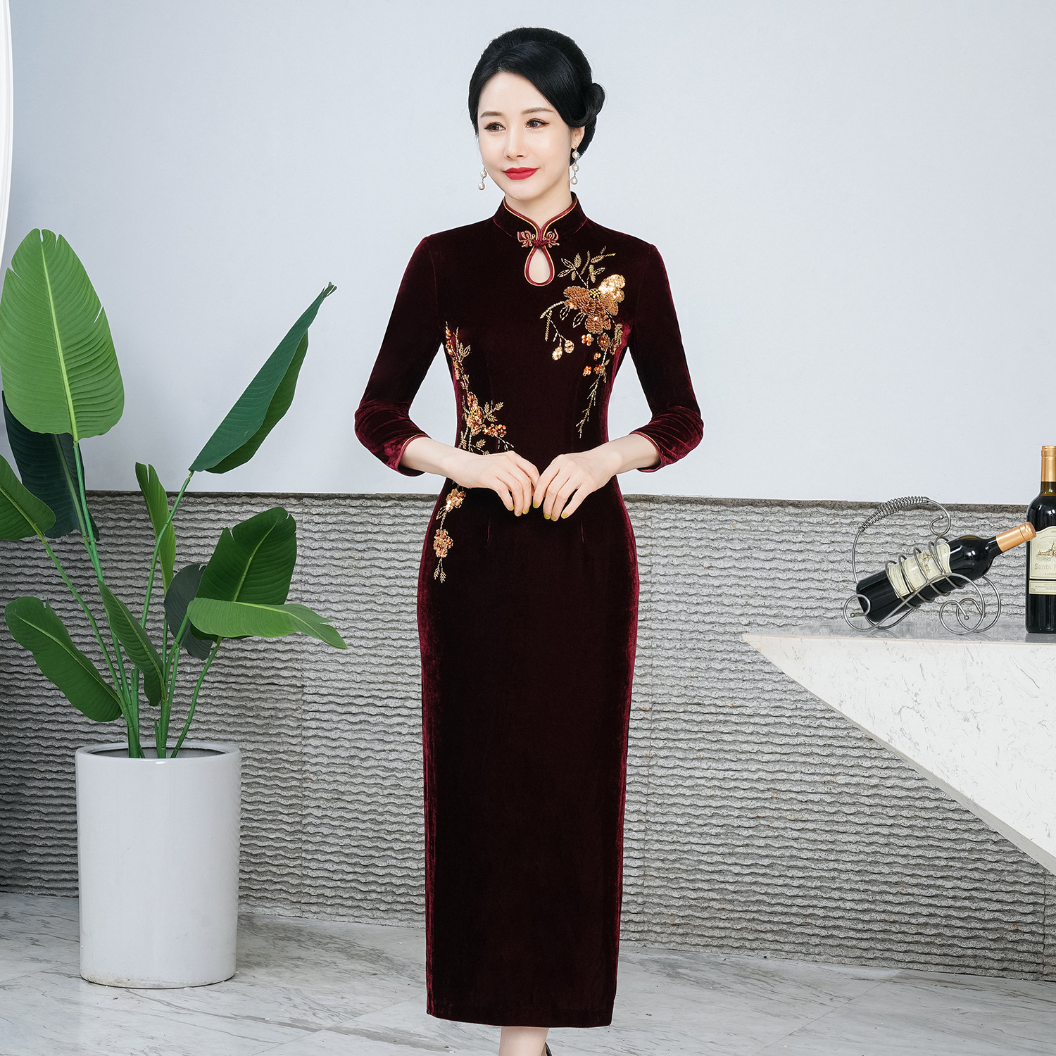 Gaun ibu musim dingin tebal baru gaun cheongsam pernikahan perjamuan pernikahan gaun bahagia ibu mertua Gaun perjamuan pernikahan berbingkai panjang elegan