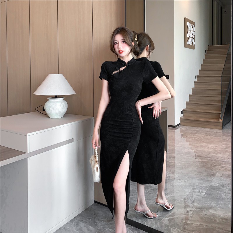 5261 gaun cheongsam seksi wanita teknisi pakaian kerja gaun pas badan rok pelangsing rok pinggul hitam ketat pinggang