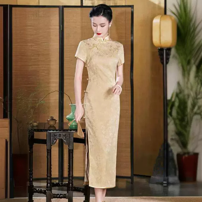 Gaun cheongsam sutra murbei tenun halus kualitas tinggi, model baru musim panas 2025, gaya Cina elegan, gaya nasional, cocok untuk pesta pernikahan dan acara resmi.