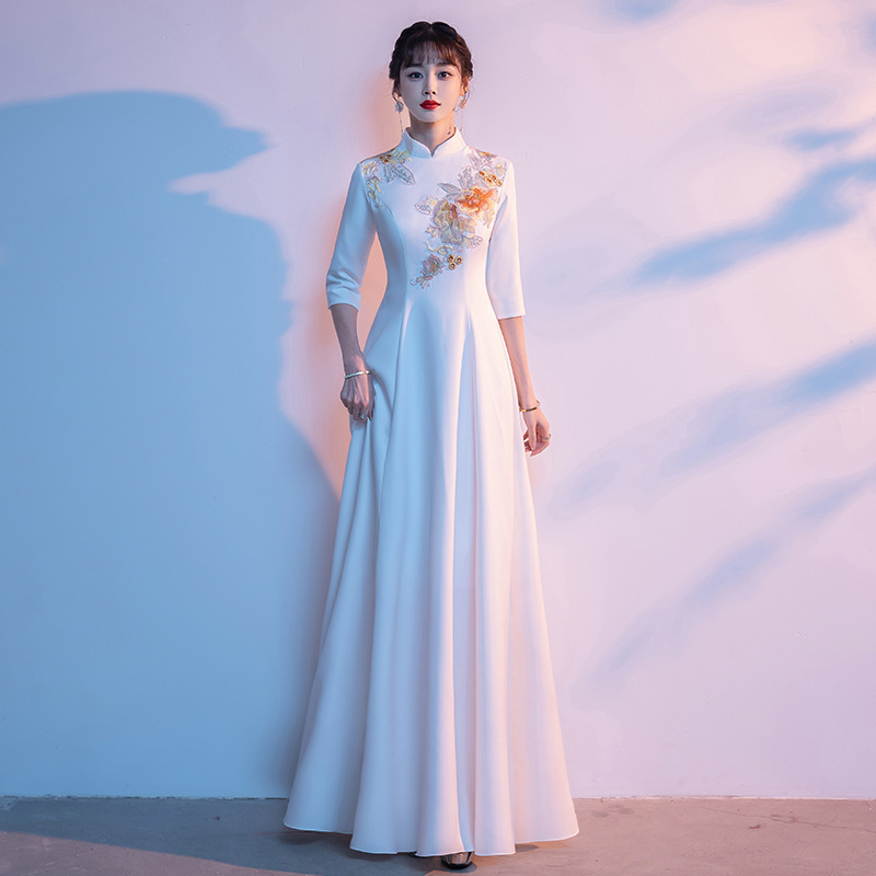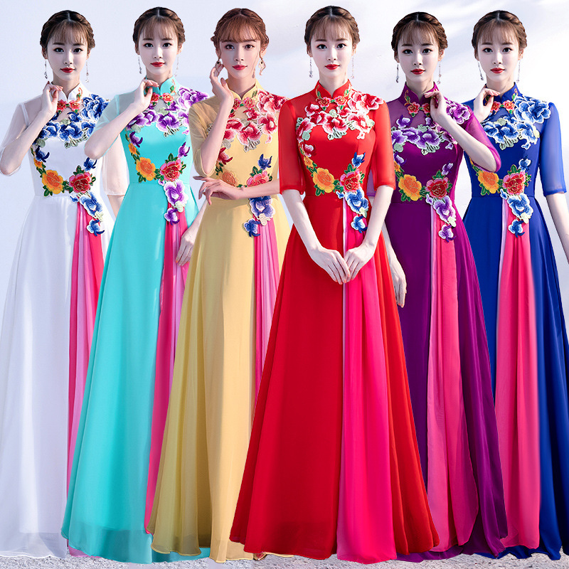 Gaun pertunjukan paduan suara cheongsam kerah tegak ala Cina untuk wanita, gaun panjang, model baru 2025, gaun malam untuk penyambutan tamu.