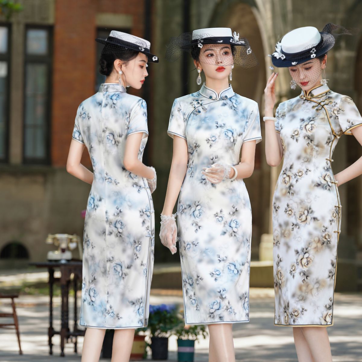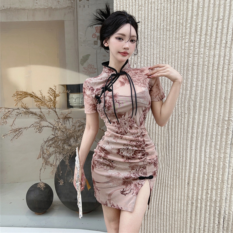Gaun cheongsam ketat gaya Tiongkok, baju wanita midi retro, baju cheongsam ditingkatkan, lengan pendek musim panas, baju pinggang ketat
