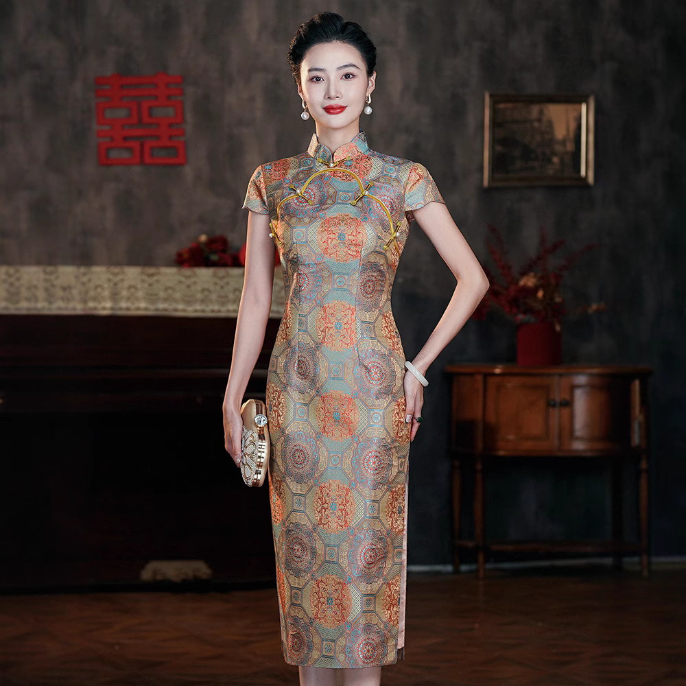 Cheongsam Perjamuan Pernikahan Ibu mertua Model Baru 2025 Lengan Pendek Gaya Tiongkok Muda Acetacic Jacquard Gaun Pernikahan Ibu 60711