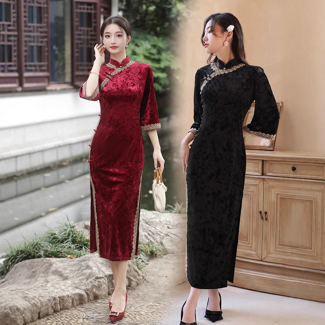 Gaun lengan 2023 beludru emas wanita, Gaun panjang terbalik lengan besar harian retro cheongsam grosir untuk musim gugur 3/4