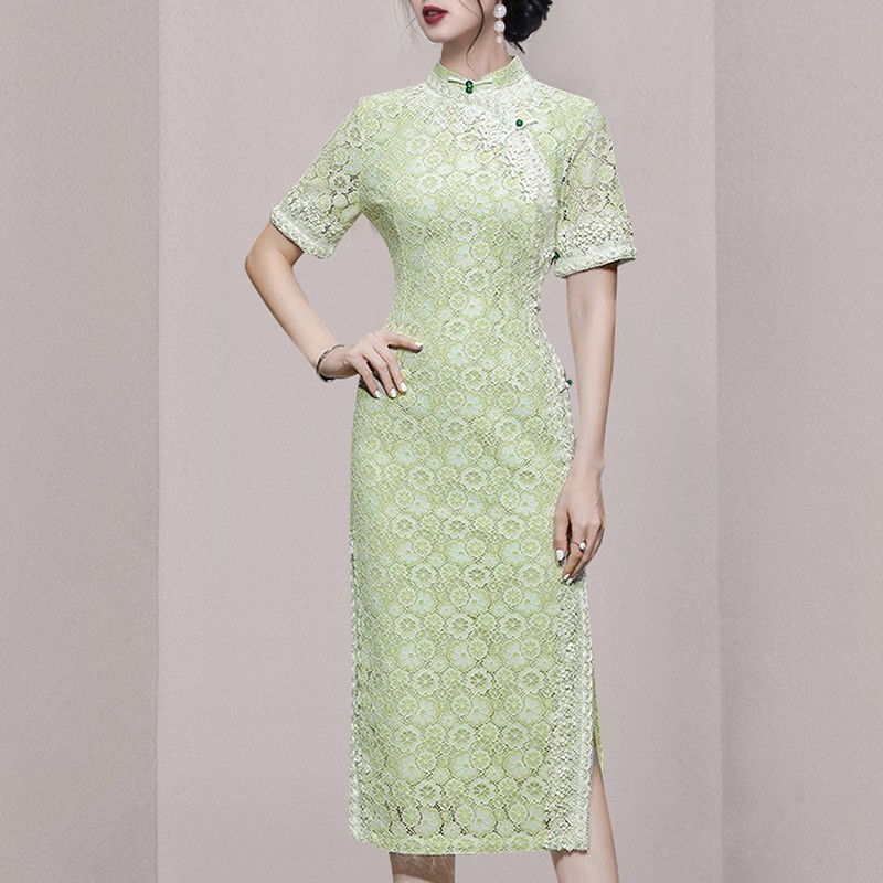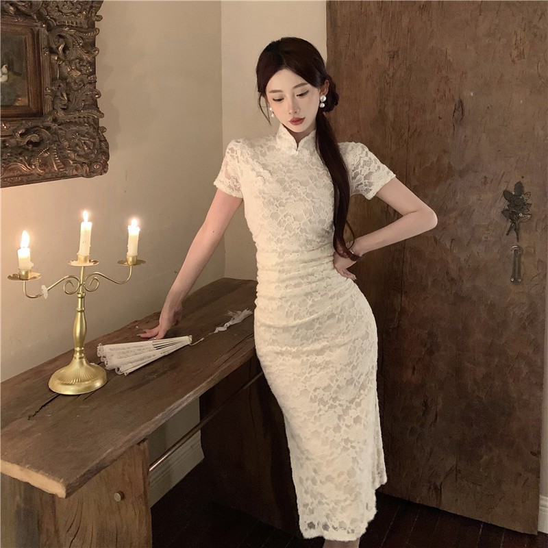 Gaun cheongsam belah pinggang temperamen lembut Tiongkok baru gaun renda mode baru musim panas wanita lintas batas