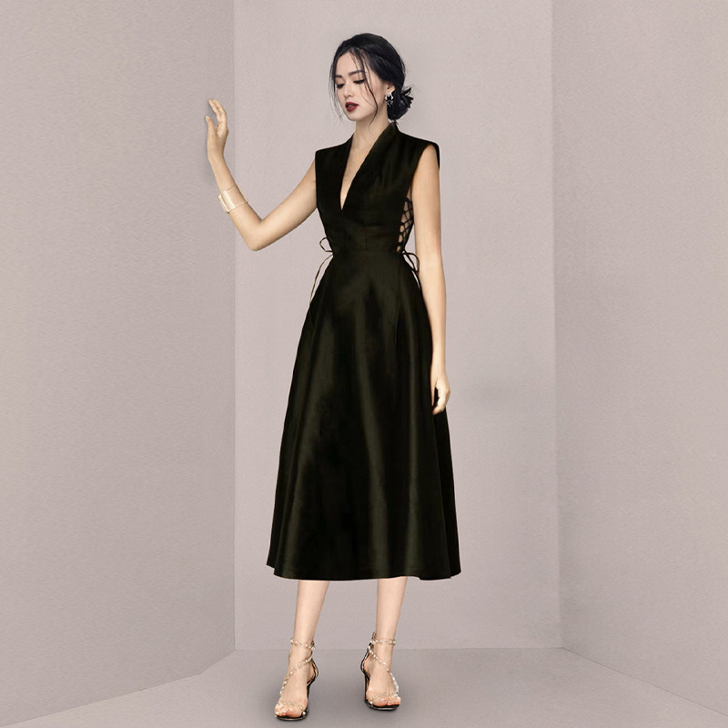 Gaun cheongsam panjang tanpa lengan, gaun hitam tanpa lengan satin pinggang bocor samping leher V dalam berdiri gaya Korea musim semi