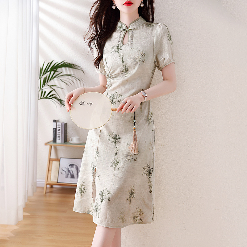 Gaun cheongsam daun bambu gaya Tiongkok, gaun pelangsing pinggang kerah berdiri retro mode baru musim panas 2024