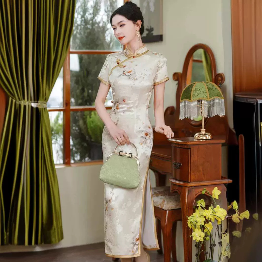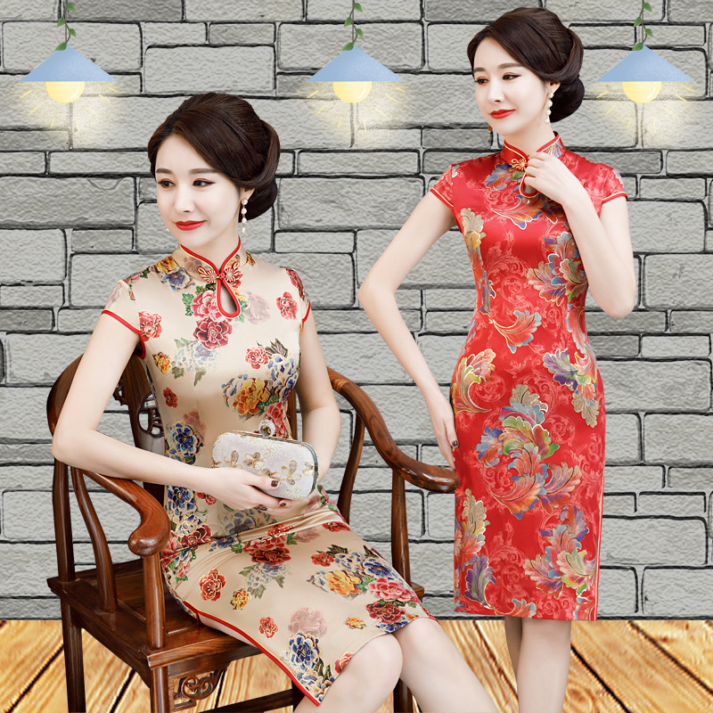 Baju cheongsam Retro Xiangyun lapisan ganda, baju cheongsam Xi mother-in-law satin wanita musim panas banquet peningkatan China grosir cheongsam