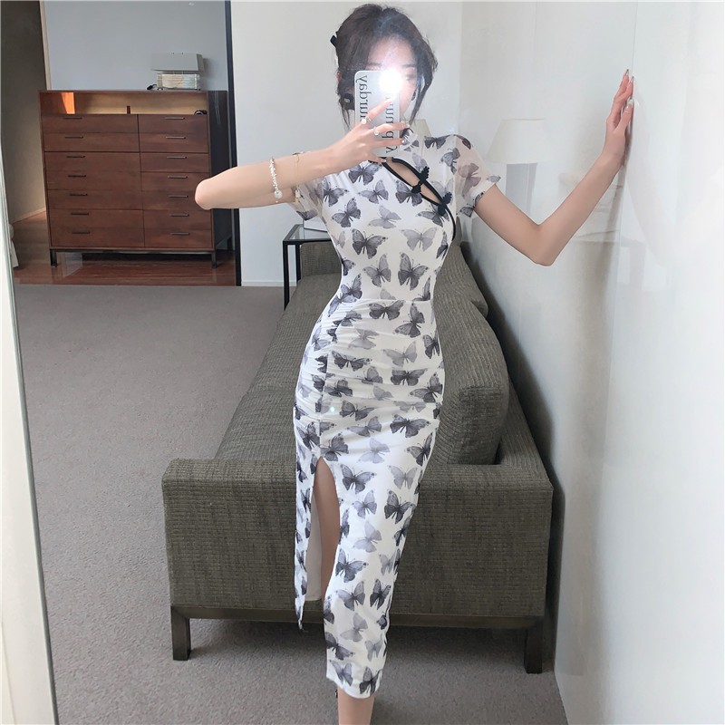 Gaun liburan motif kupu-kupu gaya cheongsam gaun lintas batas untuk wanita 2023 gaun jala elegan gaya nasional terpisah