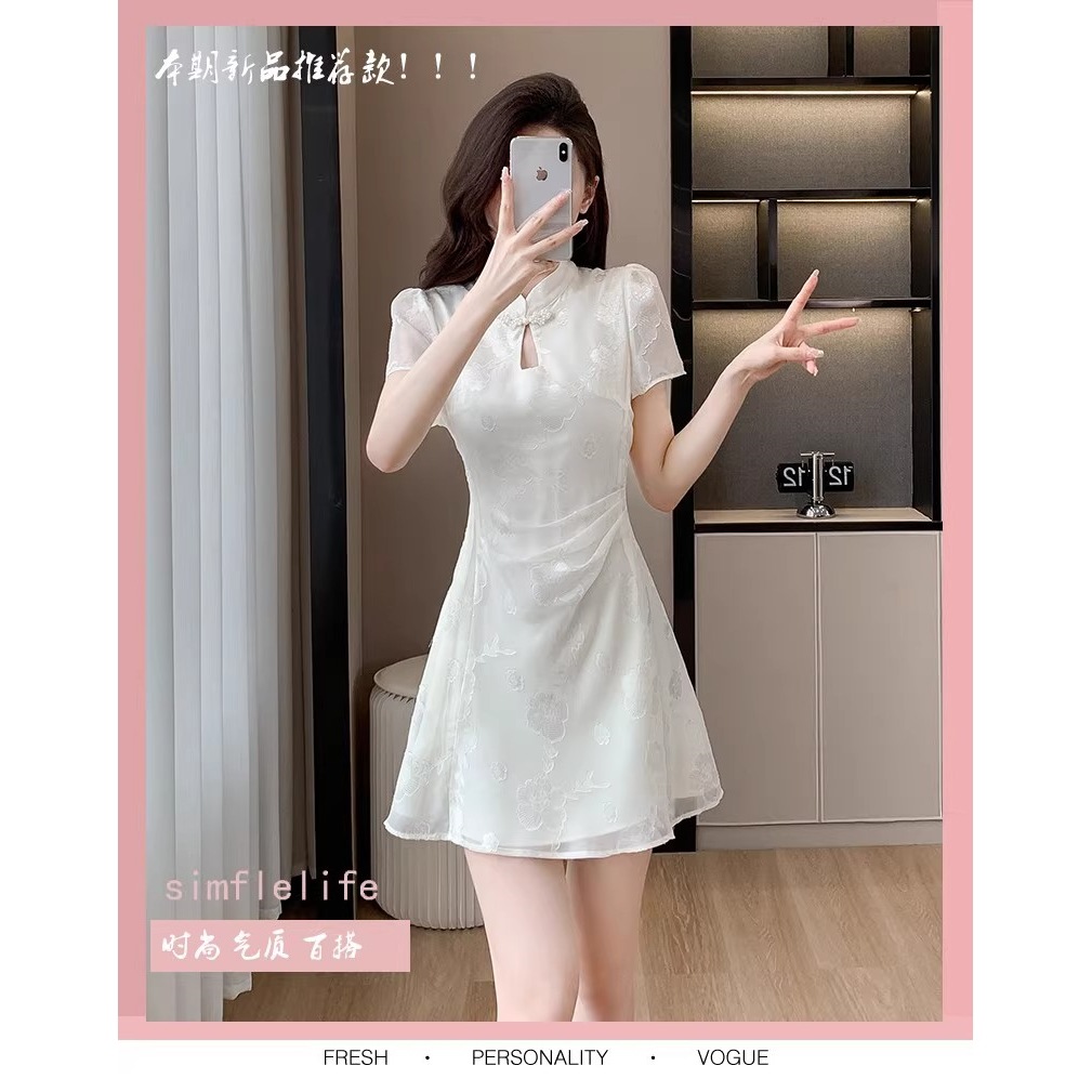 Gaun cheongsam sifon kancing gaya nasional baru musim panas 2025, gaun bunga lengan pendek kerah tegak retro bergaya Cina baru.