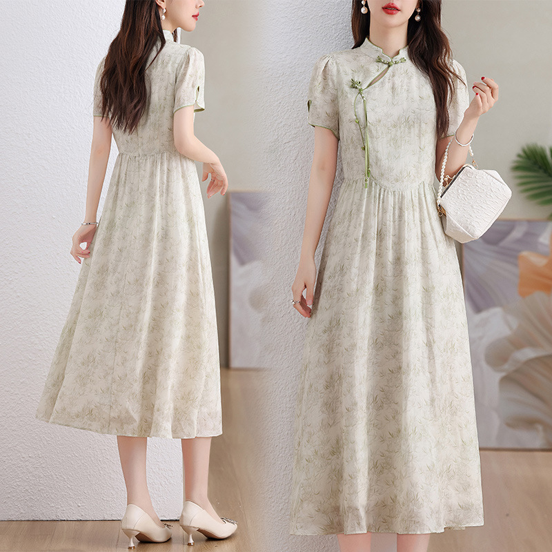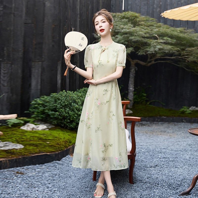 Gaun cheongsam sifon kancing gaya nasional baru musim panas 2025, gaun bunga lengan pendek kerah tegak retro bergaya Cina baru.