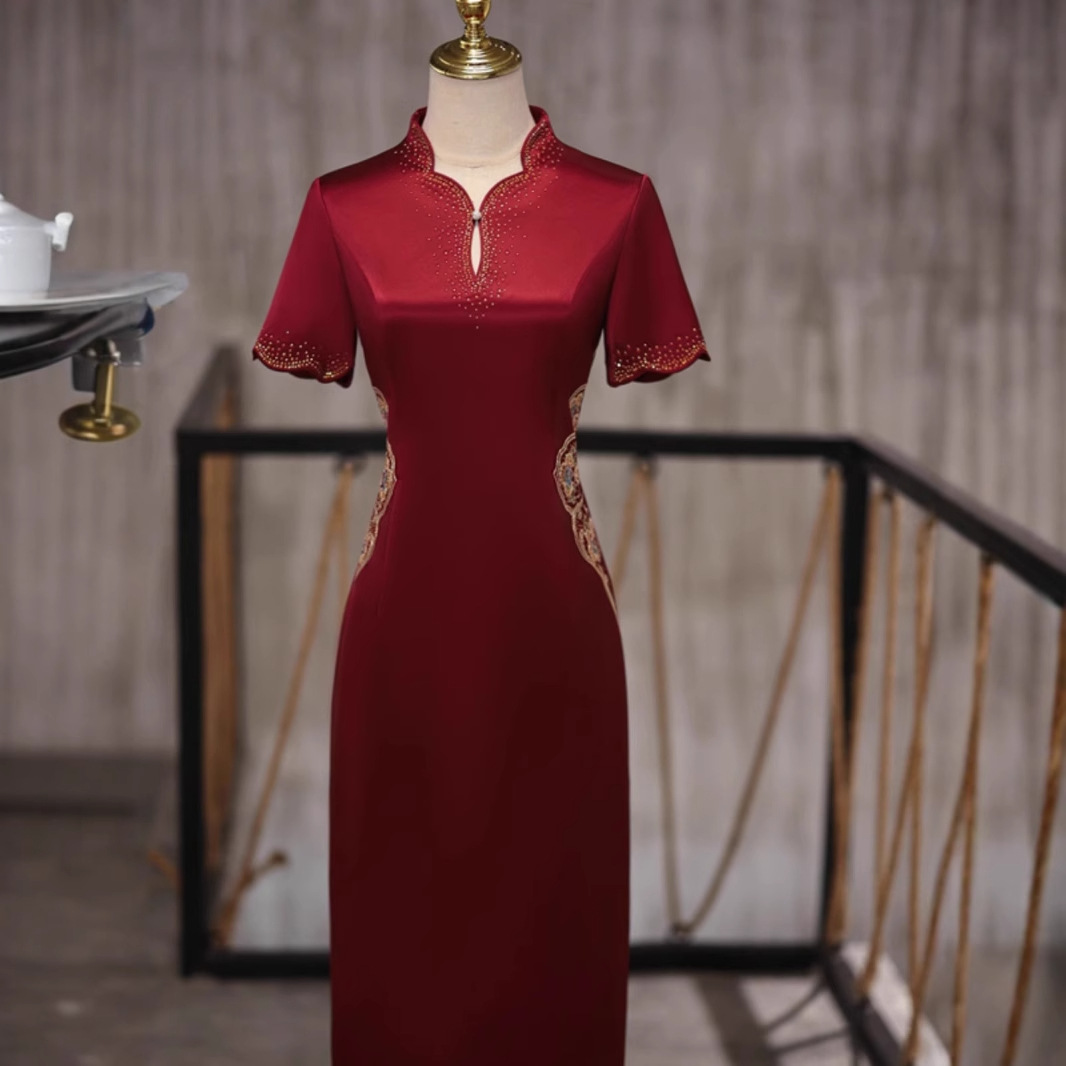 Gaun cheongsam satin asetat gaun pendek mulia gaun malam kecil ibu darurat pernikahan mertua gaun malam pelangsing