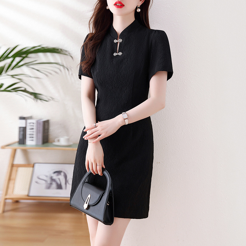 Gaun cheongsam hitam gaya Tiongkok Baru Musim Panas 2024 kerah berdiri retro gesper slim fit Gaun pelangsing
