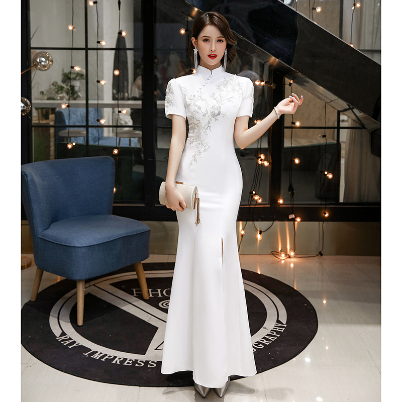 Gaun malam ekor ikan untuk wanita, gaun malam elegan kelas atas warna putih, pertemuan tahunan cheongsam panjang satin musim dingin 2024