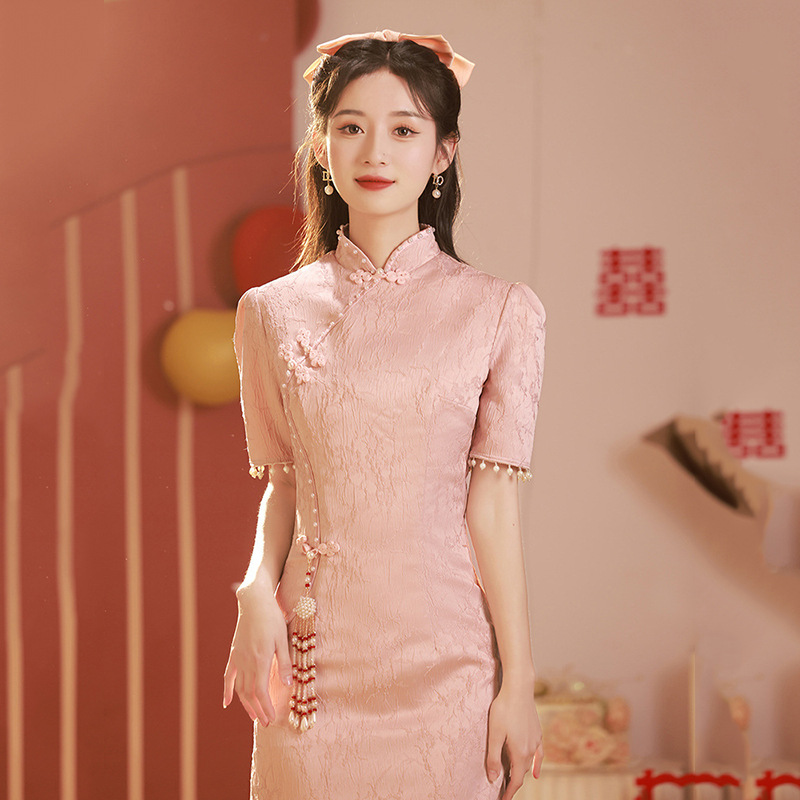 Gaun roti panggang Cina baru gaun cheongsam pertunangan merah muda pengantin gaun pintu belakang 2024 cheongsam anak perempuan musim semi baru