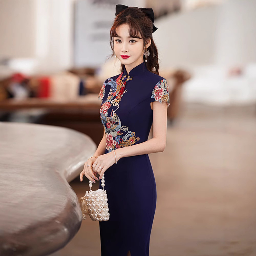 Gaun cheongsam Tiongkok biru dongker, Gaun wanita performa Pertemuan Tahunan baru 2022