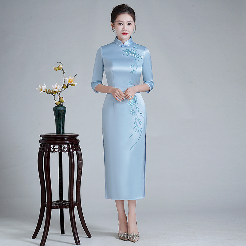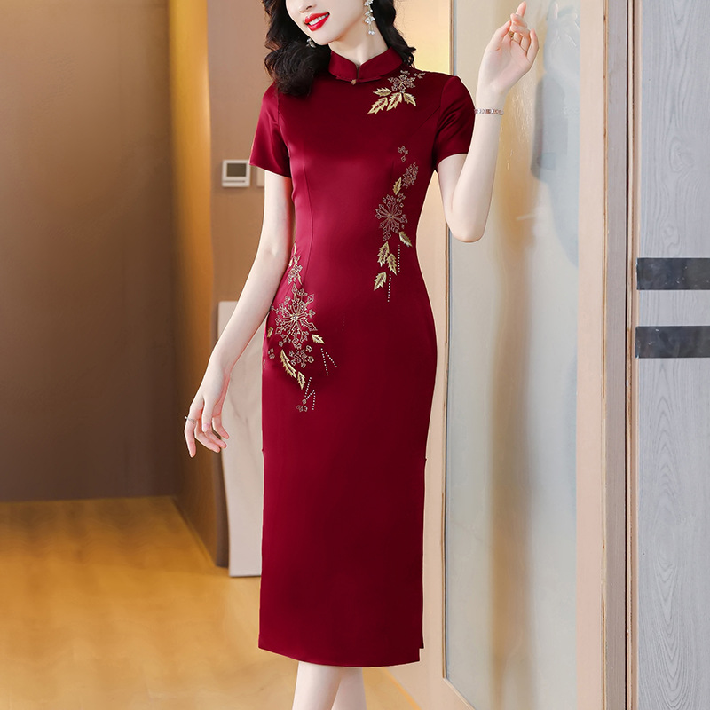 Gaun pesta pernikahan gaya baru musim semi 2025 dengan bordir mewah untuk ibu, cheongsam satin asetat gaya muda, cocok untuk dipakai sehari-hari.