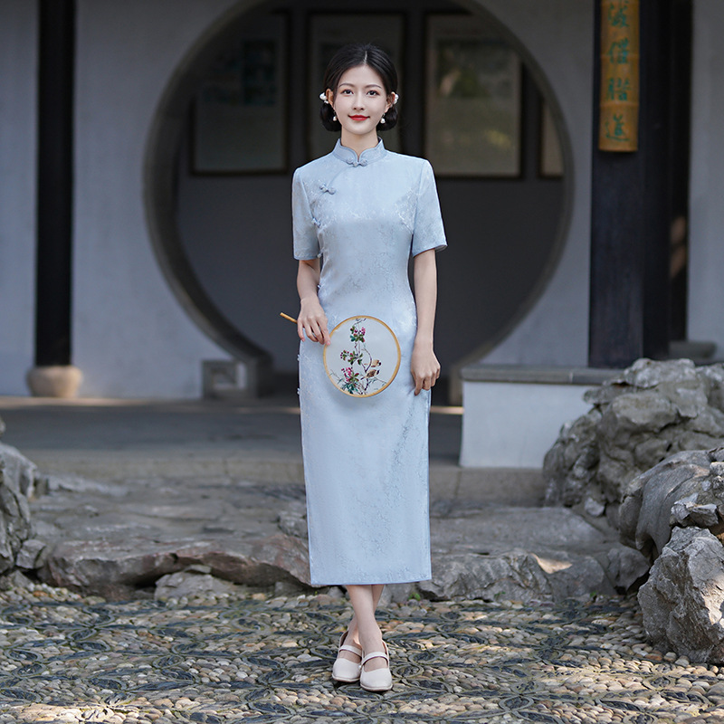 Gaun cheongsam panjang bergaya Cina untuk ibu, buatan tangan kelas atas dengan kancing penuh, bahan sutra bermotif awan, model terbaru musim panas 2025.