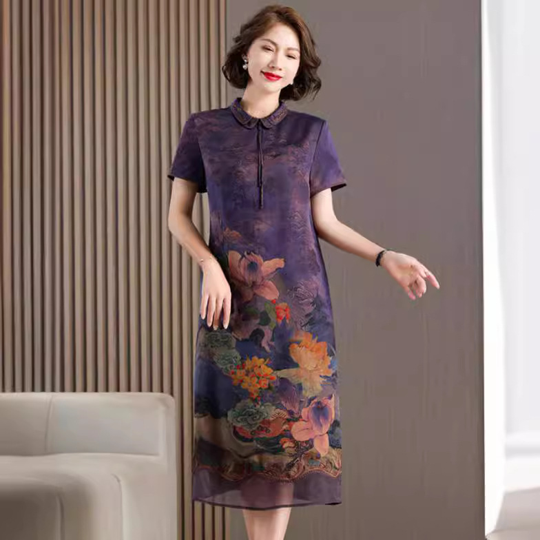 Gaun benang Xiangyun gaya Tiongkok Baru Musim Panas 2024 gaun cheongsam sutra elegan retro modis ibu baru