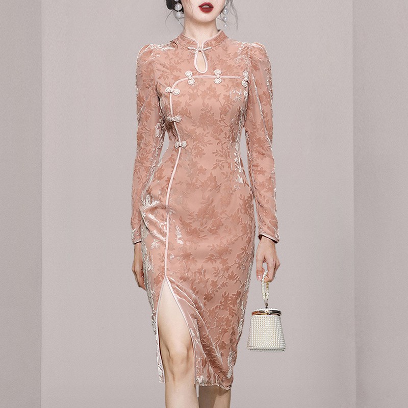 Gaun cheongsam panjang beludru gaya nasional 2023 lintas batas gaun terbelah cocok warna cetak vintage manis dan pedas
