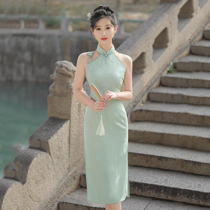 9127 Gaun Cheongsam Panjang Gaya Nasional Hijau dengan Kerah Halter, Model Baru Cina, untuk Gadis Muda, Retro, Ramping, untuk Musim Panas.