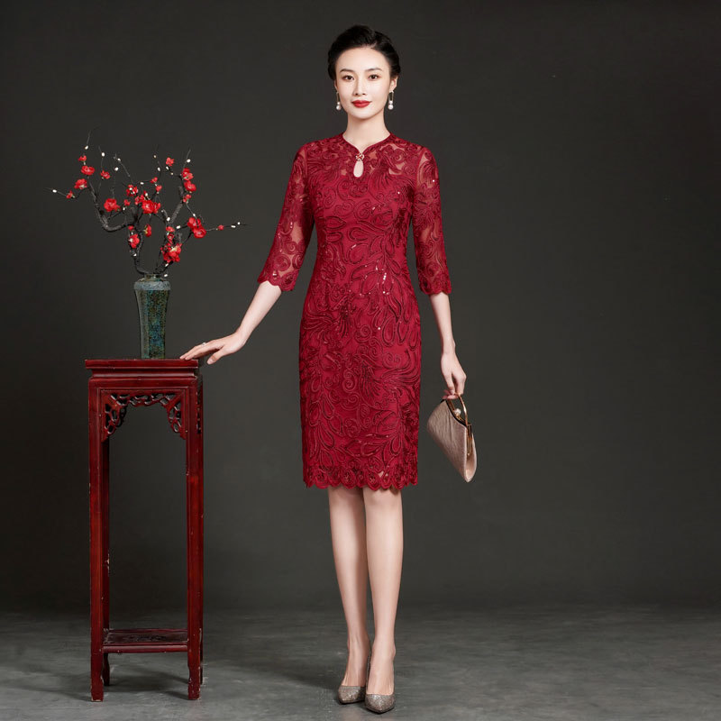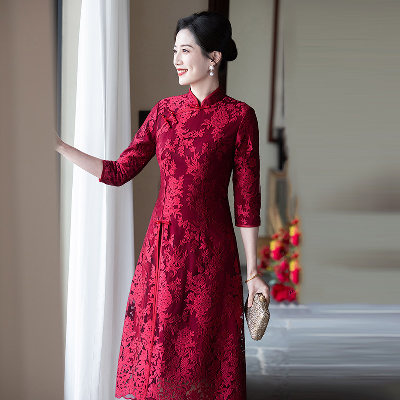 Hongyun bordir 2021 musim gugur baru renda cheongsam panjang setengah lengan mode retro ditingkatkan pernikahan Toast merah