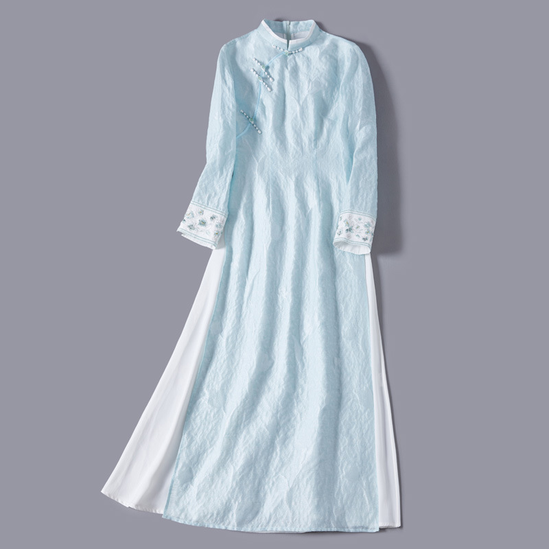 Gaun cheongsam musim panas 2025 model baru dengan sambungan warna kontras, gaun panggung pertunjukan artistik panjang kelas atas, bebas kusut.