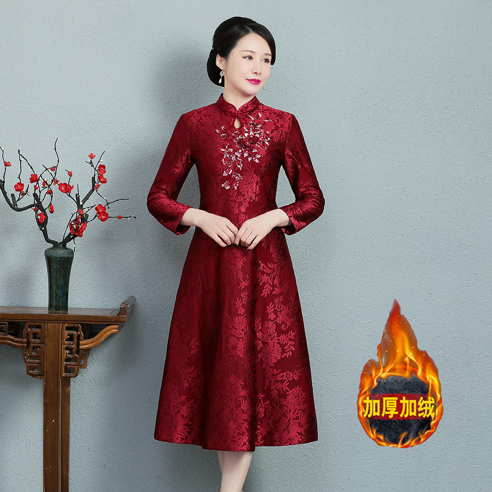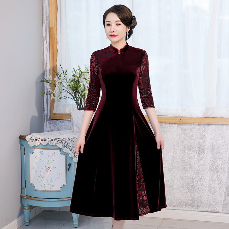 Gaun cheongsam gaya Tiongkok retro ditingkatkan, pakaian wanita ukuran besar, pakaian ibu baru musim gugur 2020, gaun cheongsam beludru Korea
