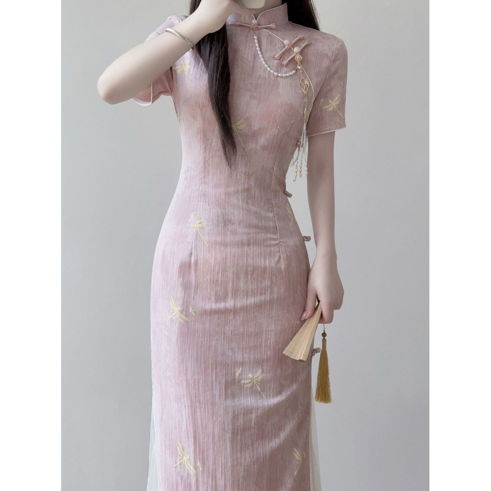 Cheongsam Gaya Tiongkok Baru Gaun Slim Fit Gaya Nasional Gadis Muda Warna Merah Muda Elegan Gaun Dingin Modifikasi Kelas Atas