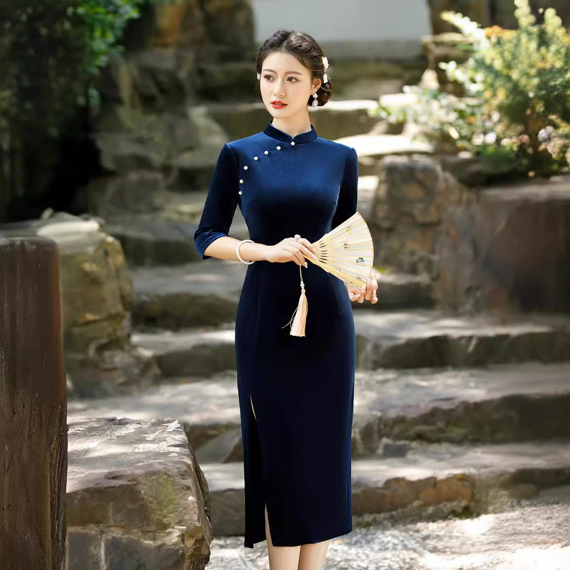 Gaun cheongsam beludru lengan setengah slim-fit retro musim gugur baru 2023 gaya China warna solid
