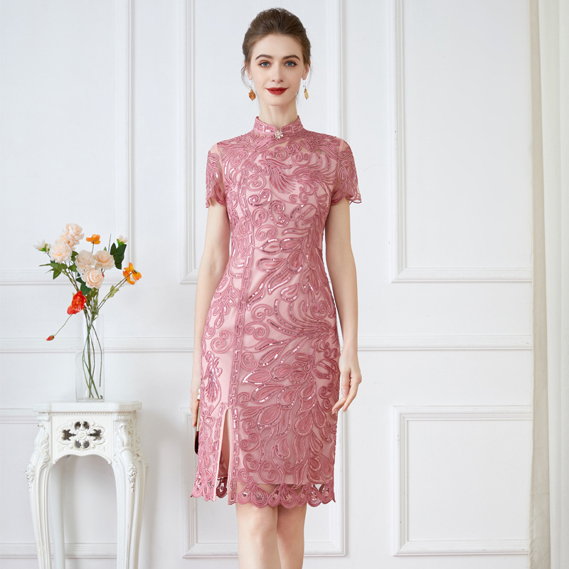 Gaun jamuan pernikahan cheongsam bahagia, kelas atas ibu mertua musim panas baru ditingkatkan pakaian ibu mertua gaun elegan elegan elegan