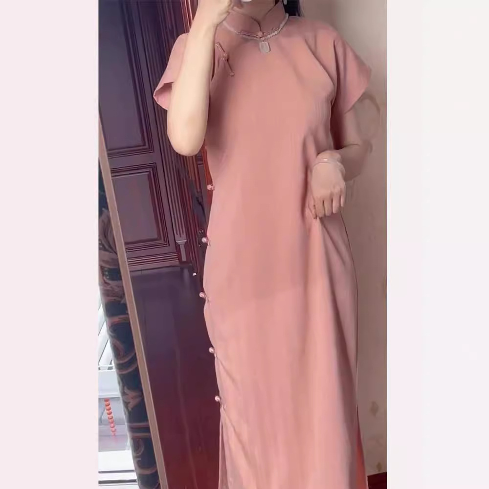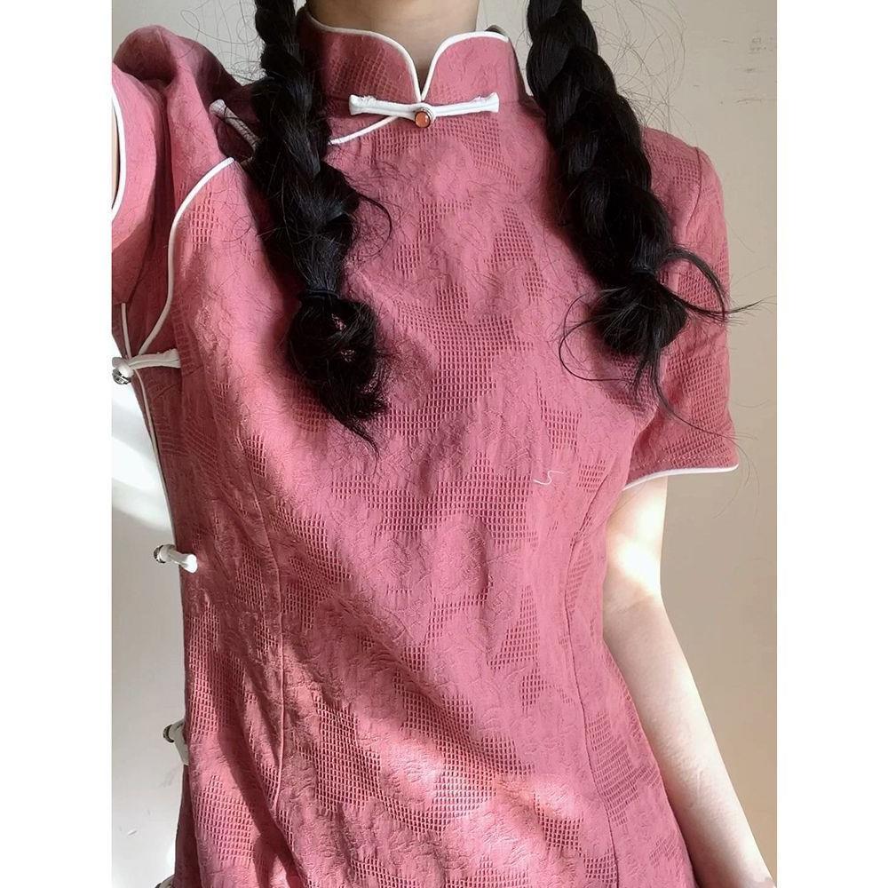 Cheongsam modern gaya Cina model terbaru 2024 untuk wanita muda, lengan pendek slim-fit retro kasual tradisional dengan delapan kancing.