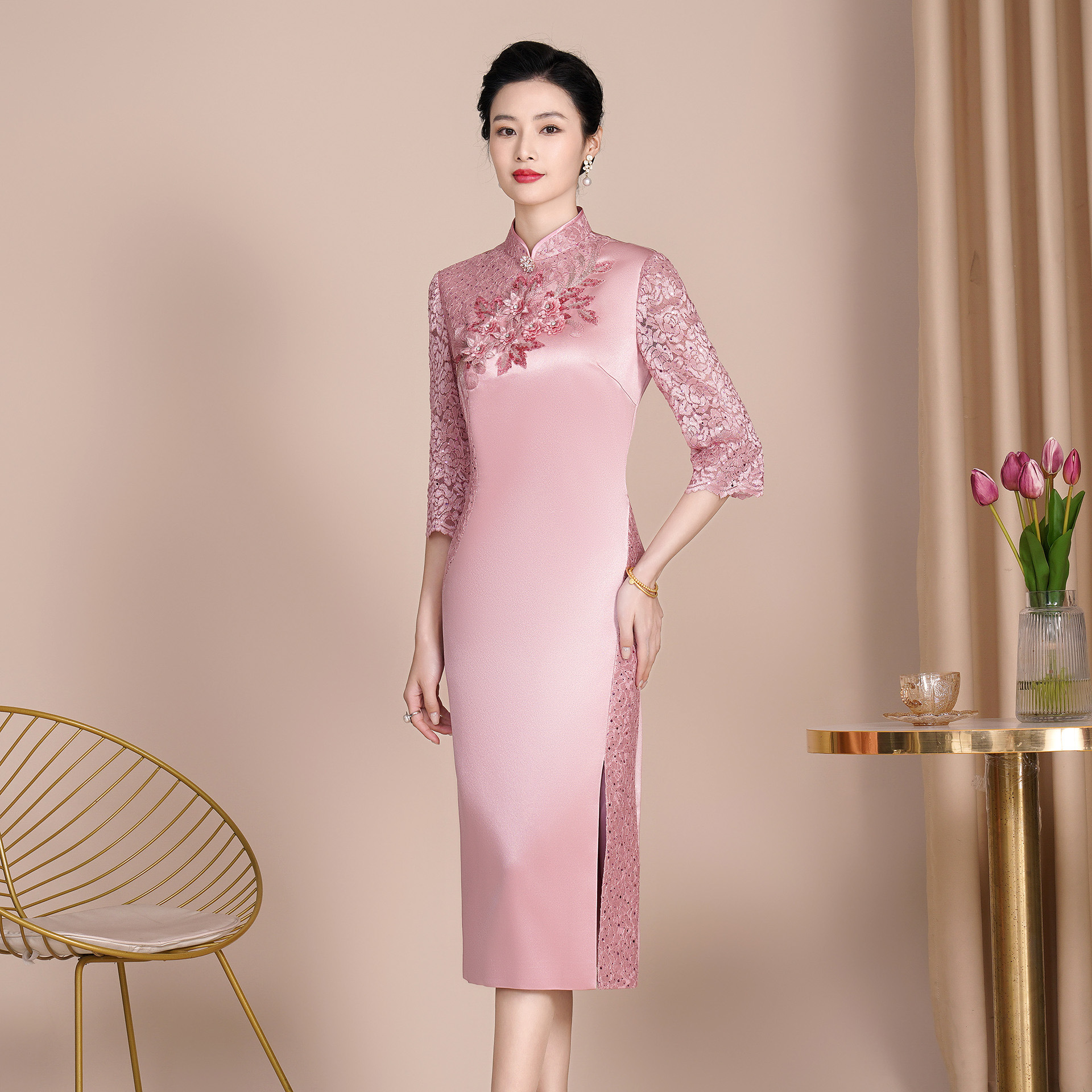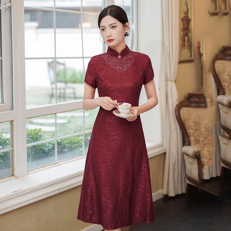 Gaun pengantin renda musim semi dan musim panas Qipao untuk ibu, gaun kasual gaya Cina baru untuk ibu, gaun gaya Cina.
