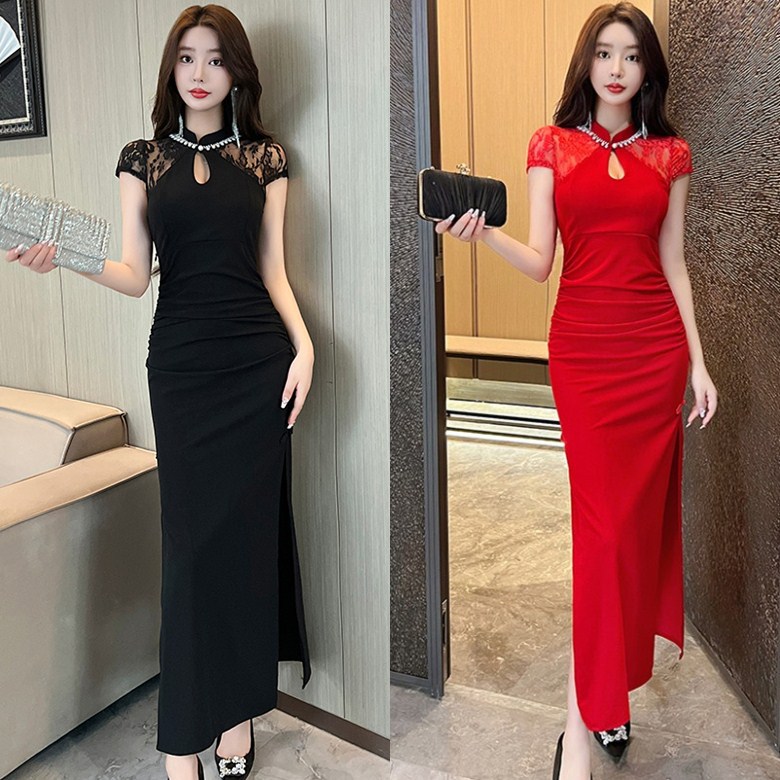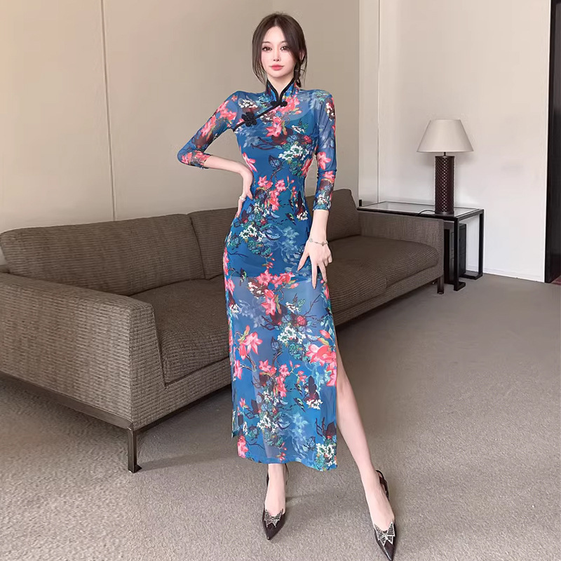 Gaun panjang cheongsam retro gaya China, Gaun malam ketat terbelah seksi 4840