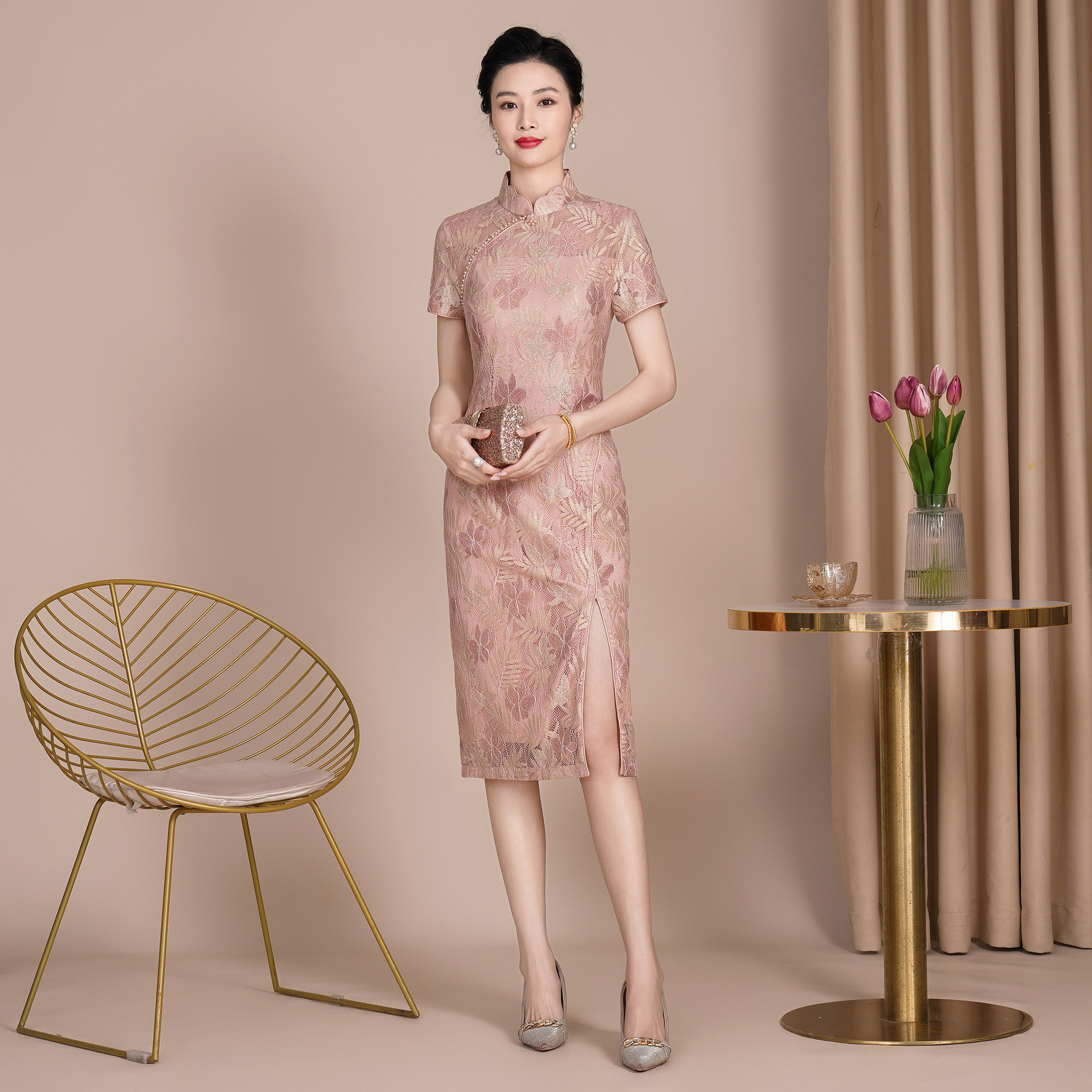 Gaya baru pakaian bersulang pendek gaya cheongsam Niang Cina merah muda pakaian roti bakar cocok dengan 150 pendek dan kecil
