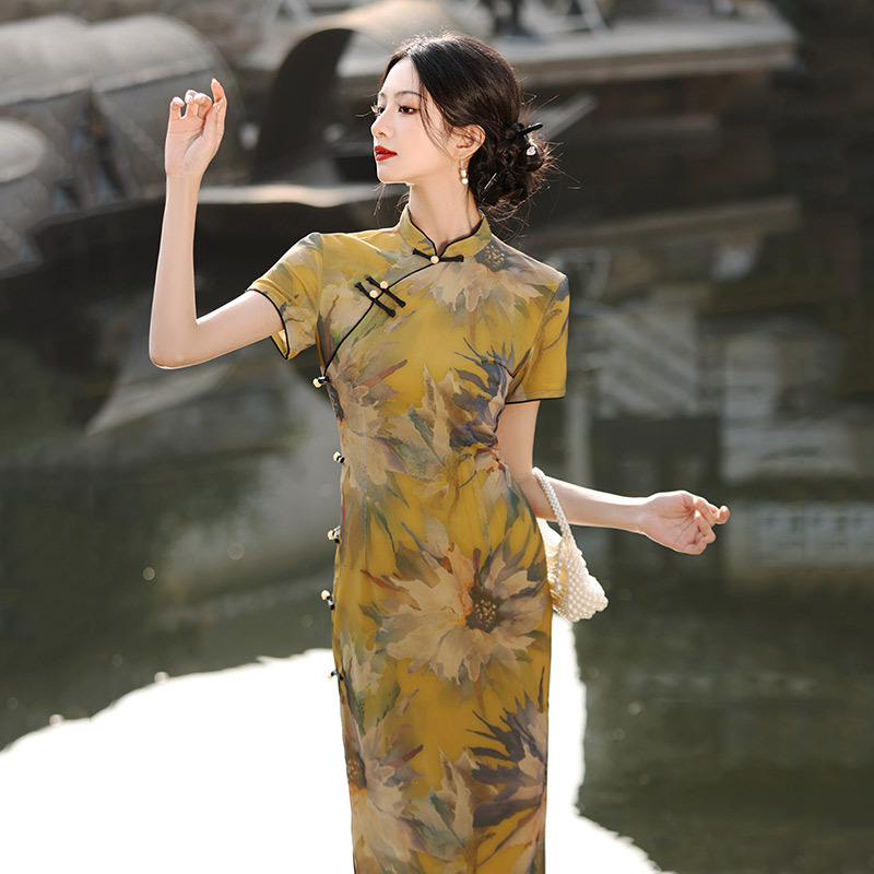 Gaun cheongsam gaya Tiongkok untuk wanita, gaun hanfu ditingkatkan baru musim panas 2024, Gaun nasional retro kerah berdiri gaya Barat