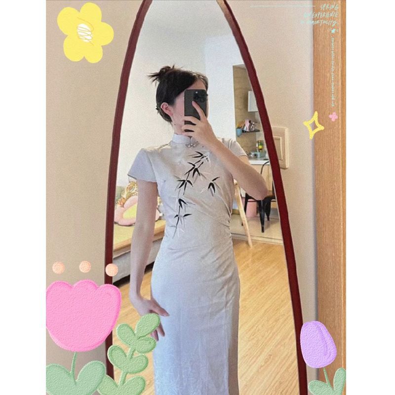 Gaun cheongsam bambu gaya segar, gaun jacquard panjang Setengah ramping temperamen gaya kuno kerah berdiri