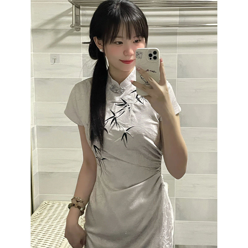 Gaun cheongsam ditingkatkan gaya Tiongkok baru untuk wanita musim panas kerah berdiri kecil antik jacquard bambu gaun pelangsing desain berlipat